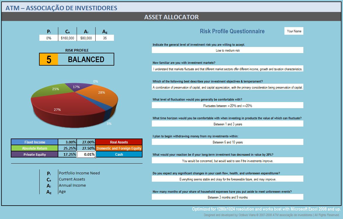 Asset AlloactorA ATM coloca à disponibiliza a Asset Allocator Calculator (AAC), uma folha de cálculo em ambiente Microsoft Excel 2007, que visa a melhor distribuição de ativos por categoria procurando a constituição ótima de uma carteira de investimentos de acordo com o perfil de risco e objetivos do investidor.